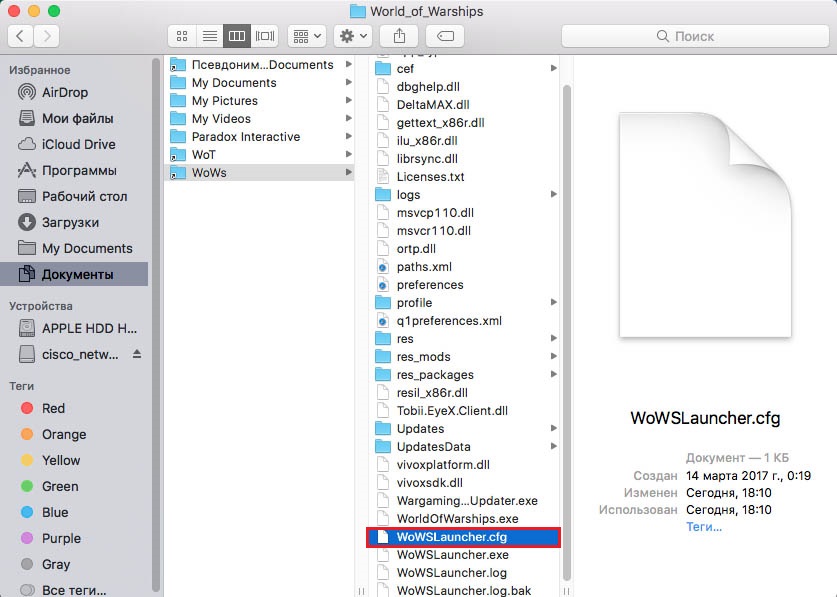 - Перейдите в «Документы» в Finder, затем в раздел World_of_Warships и откройте файл WoWsLauncher.cfg в текстовом редакторе.