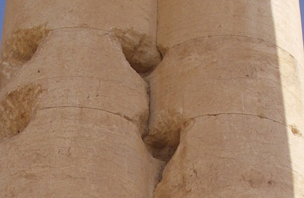 Другими словами, Храм и колонны его складывались из песчано-известковых блоков со стальными элементами, полных аналогов нынешнего железобетона, с помощью грузоподъемного крана. Привозили, стропили, ставили, монтажные петли удаляли.