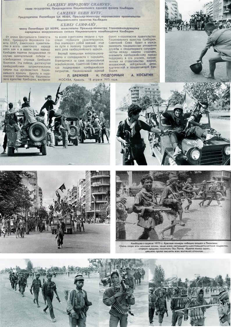 В 1979 году мир содрогнулся от чудовищных преступлений "клики Пол Пота" и "красных кхмеров". Утверждалось, что за четыре года до этого, в 1975 году они захватили власть после многолетних "гражданских войн", "агрессий", "сражений", длившихся непрерывно с 1950-х годов, вошли в Пном-Пень, уничтожили 3 млн. жителей и были сметены "вьетнамскими войсками" (в 1979 году), "вьетнамскими добровольцами", "частями восставшего генерала Самрина", "Единым Фронтом национального спасения Кампучии", много кем еще, по отдельности и вместе (в современных справочных материалах и версиях). Мало кто тогда заметил подлог. А он очевиден. На самом деле ни единого кино- и фотофакта, подтверждающего, что в Камбодже-Кампучии были какие-то "войны", "ковровые бомбардировки, уносящие десятки тысяч жизней", "сражения", "осады", "блокады", "штурмы", нет и никогда не было. Все баталии велись на словах, да и то только в последние годы. В том самом 1975 году про "красных кхмеров" никто и знать не знал. "Освобождали Пном-Пень от проамериканского режима Лон Нола" - сами читайте кто. Вырезка из газеты "Правда". "Освобождавшие войска" не были "красными кхмерами", а были они вот этими клоунами на джипах. Воины джунглей в шлепанцах и шортах, палящие в воздух разномастно одетые взрослые с непременными платочками на шеях и манерами балаганных шутов. Полюбуйтесь: сильнейшее дежавю, не правда ли? Чем не "ливийские повстанцы", "каддафисты" и прочие "туареги", война которых снималась в Катаре. Да и публика на фото удивлена, но не более. Город не забит "трупами", "голодающими", "сотнями тысяч беженцев, спасающихся от бомбардировок", как в сегодняшних писаниях.Последний ряд - это уже фото 1979 года, малолетние "красные кхмеры" о которых до этого года вообще никто никогда не слышал, "на марше". Касок не теряют, потому что нету, но тоже идиотизм. Посмотрите: боевые мины на марше за оперение не носят. А боезапасы столько весят, что мальчонки, на которых их навьючили для съемки, не пройдут с ними и километр. А предыдущая фотография использовалась дважды: сперва это были "вооруженные силы национального освобождения королевского правительства Камбоджи", а затем (этот вариант вы и видите) - "красными кхмерами" "демократической Кампучии". И флаг. Смотрите отдельное фото ниже - специально крупным планом даем.