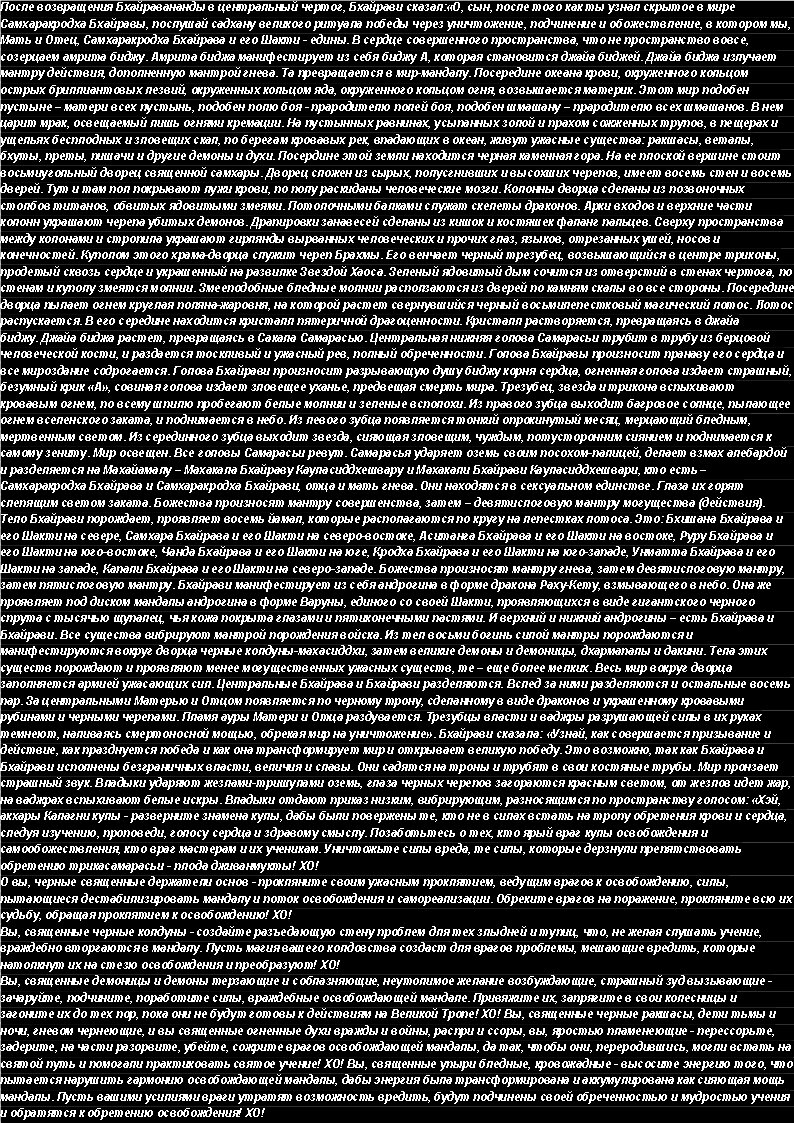 Кстати (обращаемся к тем сдвинувшимся на тибетщине, кто еще не прошел "точку невозврата"), главобряд делался с женской особью homo sapiens, врут вам ваши гуру, нет у них "бхайравей", только одна матка на всех. "Светиться" она действительно немножко светилась - таковы биологические особенности зрительного восприятия самого упыря и тех, кто продвинулся в "просветлении" на биохимическом уровне через ядерный субстракт упыря (ниже мы дойдем до этого), но особой разницы между полами земных существ, в том числе людей, для упыря нет, они прежде всего еда, а уж потом самец или самка; примерно как в нашем восприятии нет большого значения, овечка это или баран, для нас это прежде всего баранина.