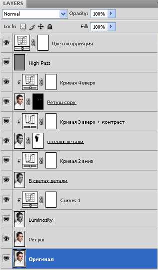 А вот слои из фотошопа ("ретуш" - опечатка. Правильно - "Ретушь"):