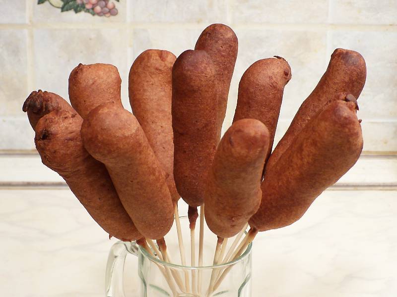 Corn dog по-техасски. Сосиска в тесте на палочке. Выглядит аппетитно.