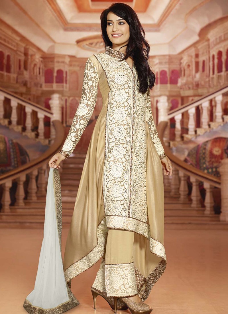 Неудивительно, почему Elie Saab славится своей невероятной вышивкой бисером и нитками — он с Востока (род. в Ливане), а там знают в этом толк. Я с трудом нашла одноцветный приглушенный бежевый костюм, но даже его отвороты были украшены камнями и бисером! Девушка должна сиять и блистать, и лучше shine bright like a dimond в невесомом ярком сари, украшенном стразами и камушками.