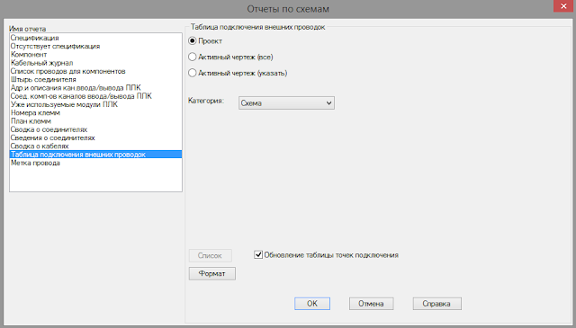 В диалоговом окне «Отчеты по схемам» выбираем имя отчета «Таблица подключения внешних проводок», область извлечения данных для отчета и нажимаем ОК.