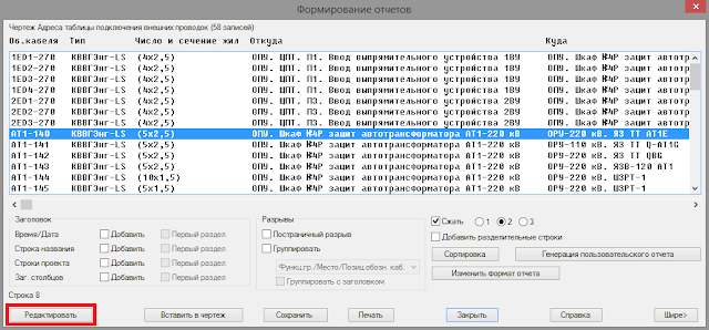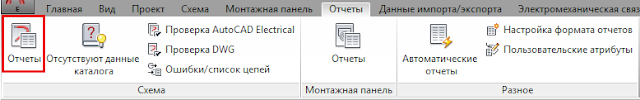 Для формирования кабельного журнала по схеме кабельных связей запускаем «Отчеты» на панели «Схема» вкладки «Отчеты».