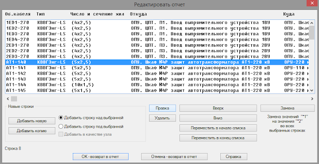 Теперь интересный отчёт по трассам. Интересен он тем, о чём я писал выше — оно считает коэффициент заполнения трассы. Кое-где у меня не все данные вбиты, поэтому цифры плавают. Запись «F: xx%» показывает количество свободного места в трассе исходя из заданного К1 (обычно по ГОСТу это 40% после полной укладки кабелей). А ещё можно например посмотреть суммарное сечение всех кабелей и полезть в каталог каких-нибудь проволочных лотков, чтобы там подобрать нужный, в который все кабели влезут.