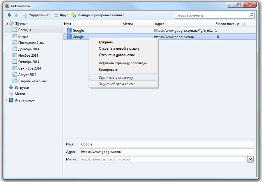 Гораздо удобнее организована работа с «Журналом» в Mozilla Firefox. Он расположен прямо в меню. Выберите «Журнал» - «Показать весь журнал».Откроется окно, где вы сможете не только удалить отдельную адресную строку. Выберите «Управление» - «Выделить все» и очистите историю за какой-то конкретный период времени.Если в этот период времени вы хотите удалить только один адрес, нажмите в контекстном меню пункт «Забыть об этом сайте». Все сведения о нем удалятся из истории.