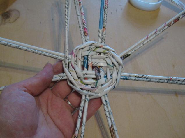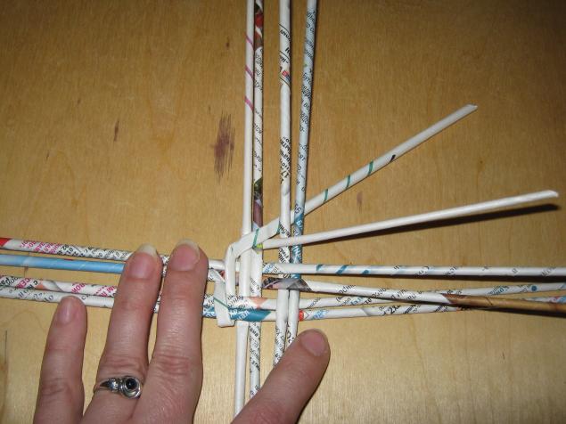 3. Теперь начнем оплетать дно корзинки одной из трубочек. Трубочку берем там, где их 5.
