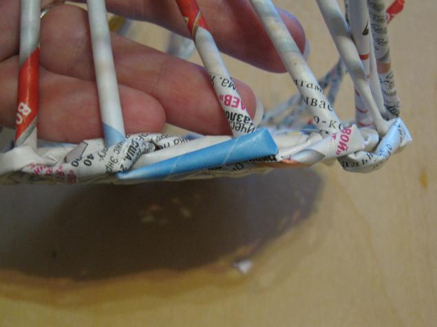 16. Ручку я плела с помощью двух трубочек, которые вставила между прутьев корзинки и загнула на 2 части. Получилось 4 газетных нити.