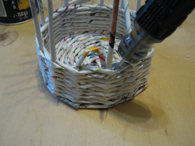 7. Как только вы решили, что высота будущей корзинки вас устраивает — аккуратно загните края вертикальных трубочек, вставляя в петли, а концы горизонтальных прячьте внутри. Помним про клей.
