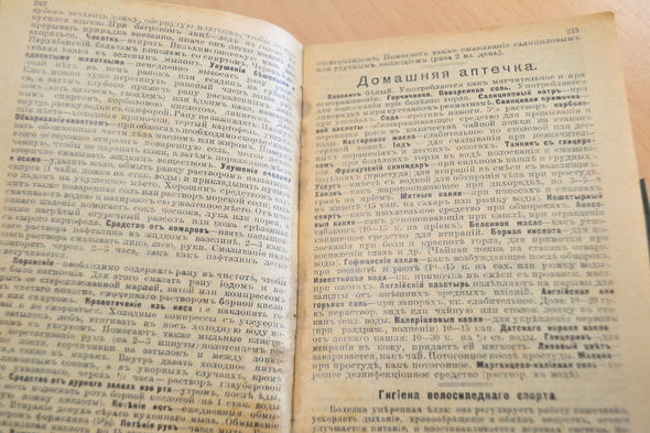 И не менее полезный — рекомендации при отравлении алкоголем и других недугах. «Холодные обливания водой головы; руки и ноги — в тёплую воду. Клистир (клизма) с касторовым маслом и солью. Нюхать нашатырный спирт и его же внутрь от 5 до 10 капель на половину стакана воды. Содовые порошки, чёрный кофе и сон».