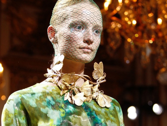 Jean-Paul Gaultier haute couture весна-лето 2014. Прически многих моделей украшены разнообразными бабочки, ткани с принтами насекомых, кружевами и вышивкой, даже платья в форме бабочек и закрывающий показ выход Диты фон Тиз, тоже в виде бабочки: