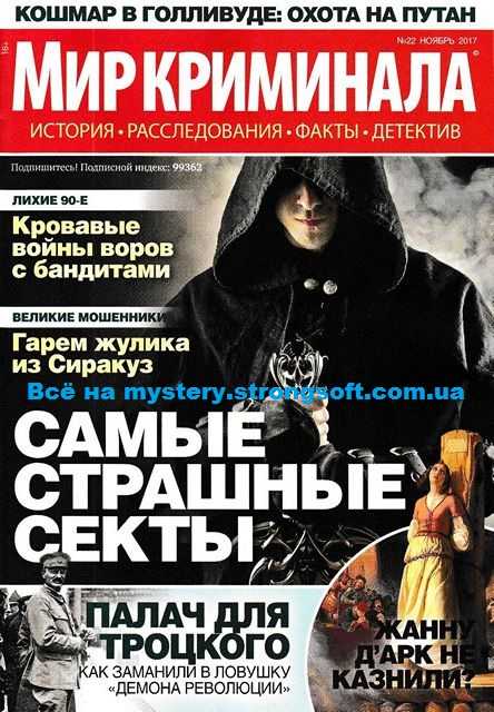 Читать онлайн, скачать Мир криминала №22-2017 в формате PDF. В этом номере читайте: Самые страшные секты. В переводе с латинского слово secta означает «школа», «учение». Формально в самом понятии нет ничего негативного, однако для современного человека оно ассоциируется с нетерпимостью, фанатизмом и абсурдной готовностью отдать свою и чужие жизни во имя некоего субъекта, именующего себя Учителем, Пророком или даже мессией. Психологи считают что в мире есть определённая категория людей внушаемых, не склонных самостоятельно выстраивать свою жизнь…