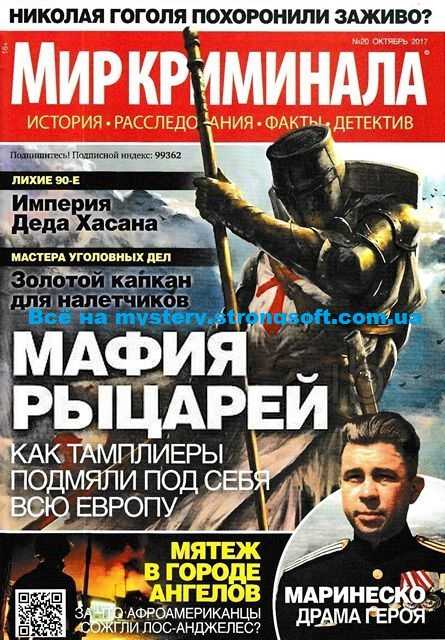 Читать онлайн, скачать Мир криминала №20-2017 в формате PDF. В этом номере читайте: Мафия рыцарей. Как тамплиеры подмяли под себя всю Европу. Среди рыцарских орденов тамплиеры были вторыми по древности (после госпитальеров) и первыми по загадочности. Историки до сих пор не могут прийти к единому мнению, кто они в большей степени: истовые христиане или сатанисты, храбрые воины или матёрые интриганы, честные коммерсанты или мафиози. Рождение ордена считается 1118 год, а его основателем и первым главой — Гуго де Пейн и окружил он себя отрядом из семи сподвижников.