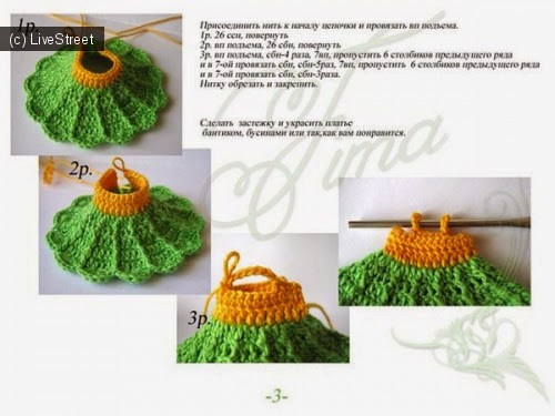 3 ряд: 1 в. п. подъема, 25 сбн Далее свяжите юбку по схеме:
