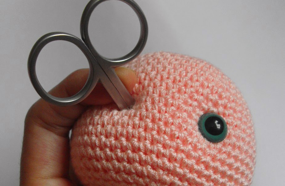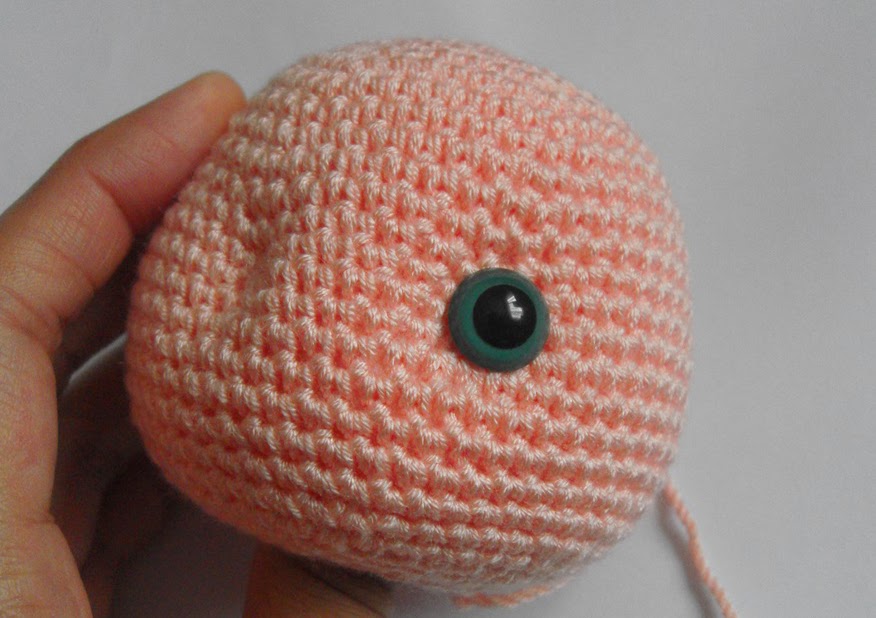 Утяжку можно делать тонкой ниткой телесного цвета. Введите иглу снизу в незашитое отверстие головы и выведите ее наружу в центре (примерно между 16-17 рядом от макушки), затем через ряд выводим иглу обратно внутрь головы, сильно затягиваем и завязываем узел образовалась «ямочка». Выведите иглу наружу в месте второго глаза (через 9 петель примерно) и через ряд снова внутрь затянули, завязали узел. Лишнюю нить отрежьте, кончики ниток спрячьте внутри головы в набивке.