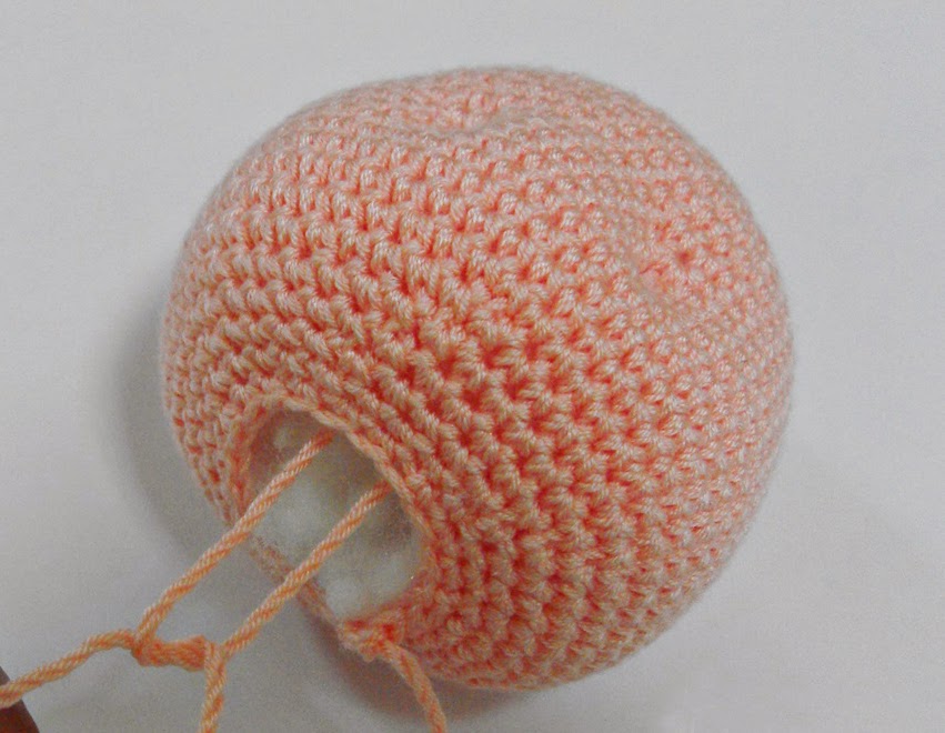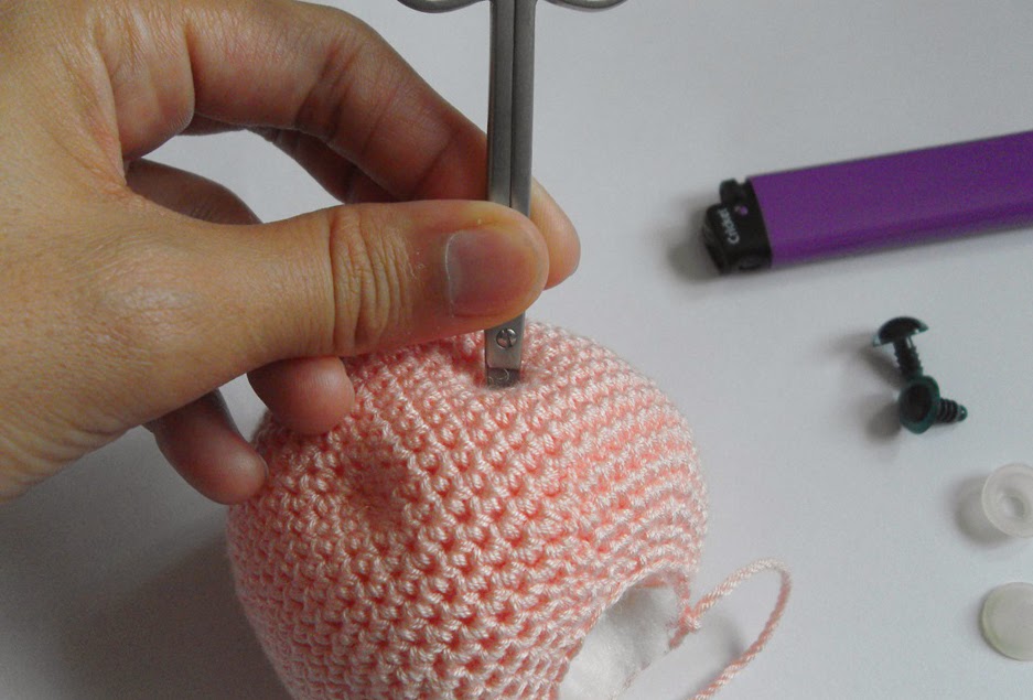 Вяжите пряжей телесного цвета. На уровне глаз отступите 9 сбн, прикрепитесь. Далее 3 в. п. подъема, 8 ссн.Хвостик нити выведите на 2 ряда выше (ниже) за ушком, хвостик нити, который остался от присоединения нити при начале вязания уха зацепите за третью в.п. подъема и выведите в том же месте, где конечный хвостик. Завяжите кончики в узел и спрячьте внутри головы. повторите для второго уха.