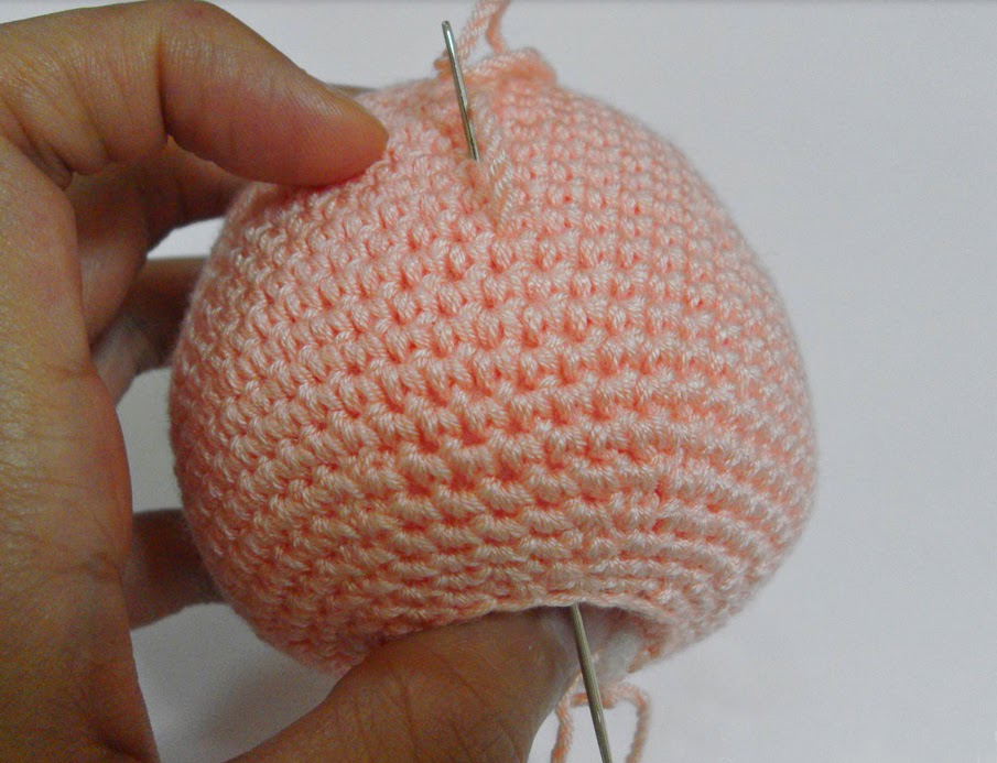 После того как голова связана, набиваем ее и делаем утяжку в области глаз. Утяжку можно делать тонкой ниткой телесного цвета. Введите иглу снизу в незашитое отверстие головы и выведите ее наружу в центре (примерно между 16-17 рядом от макушки), затем через ряд выводим иглу обратно внутрь головы, сильно затягиваем и завязываем узел — образовалась «ямочка». Выведите иглу наружу в месте второго глаза (через 9 петель примерно) и через ряд снова внутрь — затянули, завязали узел. Лишнюю нить отрежьте, кончики ниток спрячьте внутри головы в набивке.