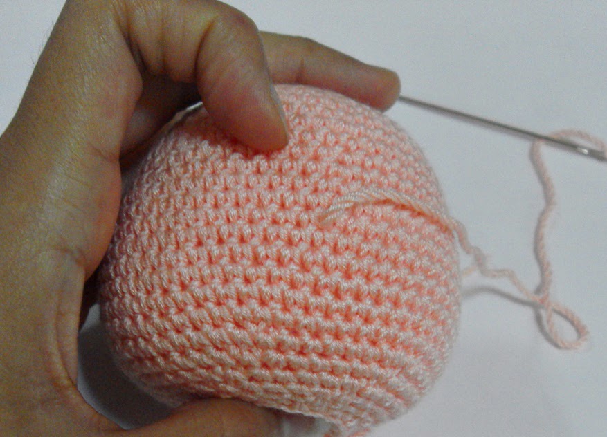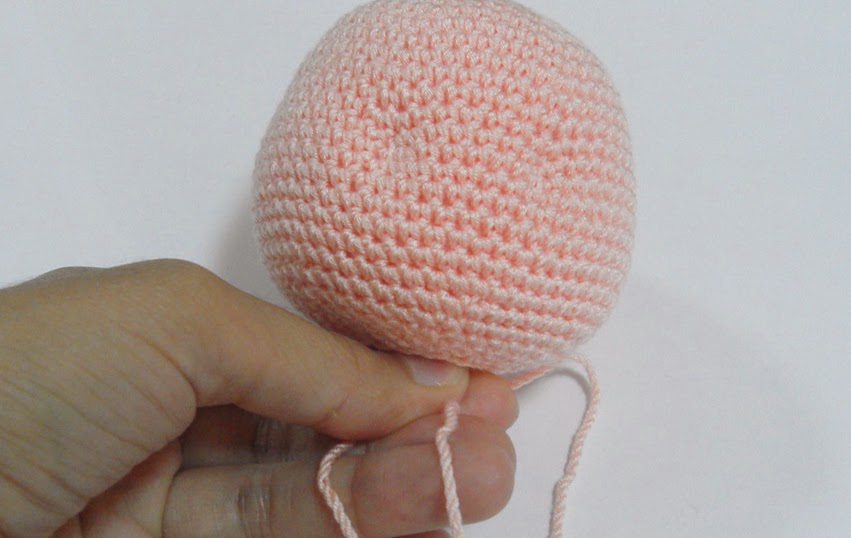Вяжем пряжей телесного цвета.1 ряд: 6 сбн в кольцо амигуруми2 ряд: 6 прибавок (12)3 ряд: (сбн, прибавка) 6 раз (18)4 ряд: (2 сбн, прибавка) 6 раз (24)5 ряд: (3 сбн, прибавка) 6 раз (30)6 ряд: (4 сбн, прибавка) 6 раз (36)7 ряд: (5 сбн, прибавка) 6 раз (42)8 ряд: (6 сбн, прибавка) 6 раз (48)9 ряд: (7 сбн, прибавка) 6 раз (54)10 ряд: (8 сбн, прибавка) 6 раз (60)11- 23 ряд: 60 сбн24 ряд: (8 сбн, убавка) 6 раз (54)25 ряд: (7 сбн, убавка) 6 раз (48)26 ряд: (6 сбн, убавка) 6 раз (42)27 ряд: (5 сбн, убавка) 6 раз (36)28 ряд: (4 сбн, убавка) 6 раз (30)29 ряд: (3 сбн, убавка) 6 раз (24)30 ряд: (2 сбн, убавка) 6 раз (18)31 ряд: (1 сбн, убавка) 6 раз (12)