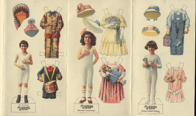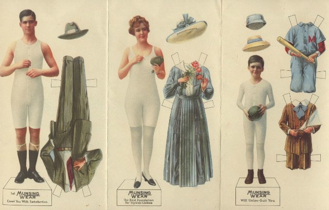 Ранние Бумажные куклы были напечатаны в одежде. Со временем были сделаны бумажные куклы, напечатанные только в нижнем белье, к которым прилагалось несколько листов одежды, напечатанных в стиле последней моде, которая держалась на куклах закладками.