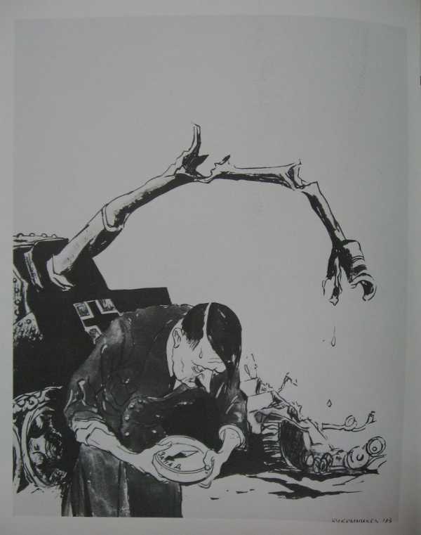И совсем другие чувства появлялись от торжественной картины Кукрыниксов «Подписание акта о безоговорочной капитуляции Германии», написанной в 1946 году, и полотна «Конец. Последние часы в ставке Гитлера», воспроизводящего бомбоубежище Гитлера в Берлине и ужас фюрера перед советскими войсками… Война закончилась, и часть победы в ней принадлежала Кукрыниксам…