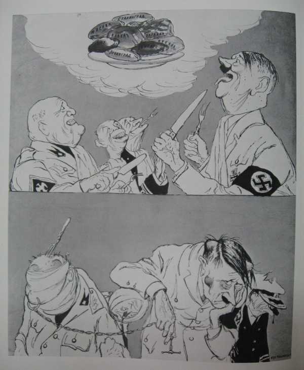 События внешней политики тоже обязательно попадали на кончики пера художников: «Двинулись к озеру Хасан, чтобы переползти через советскую границу», «Вся Европа — Гитлера и Риббентропа».