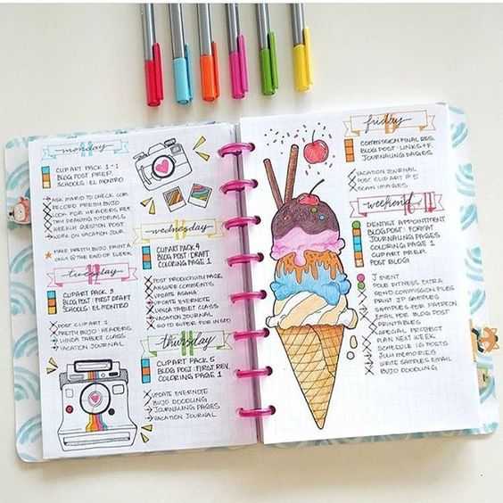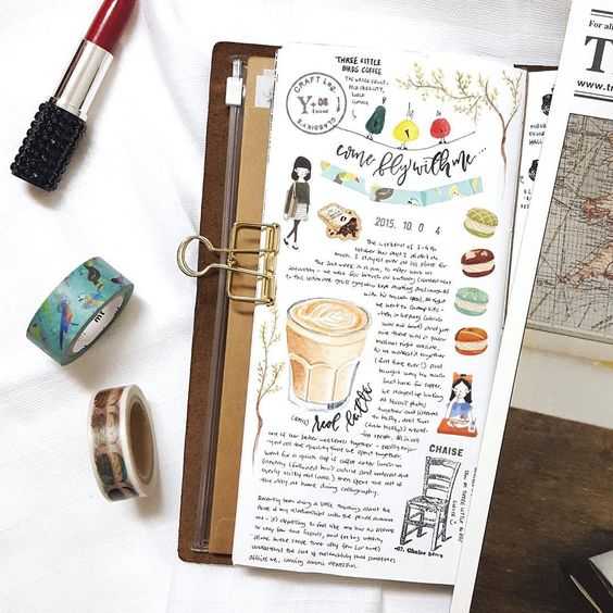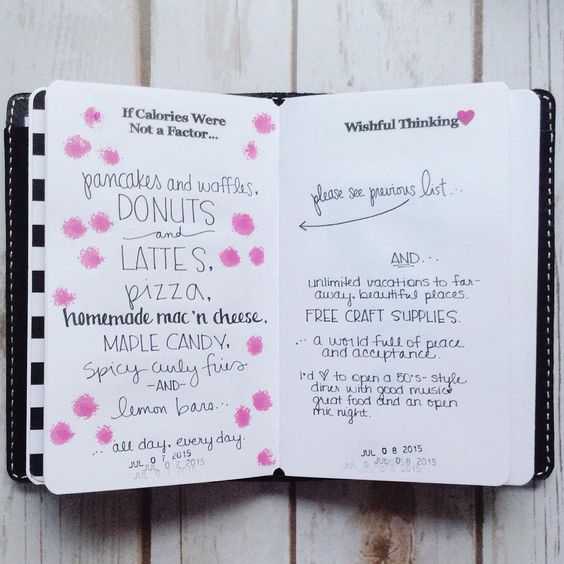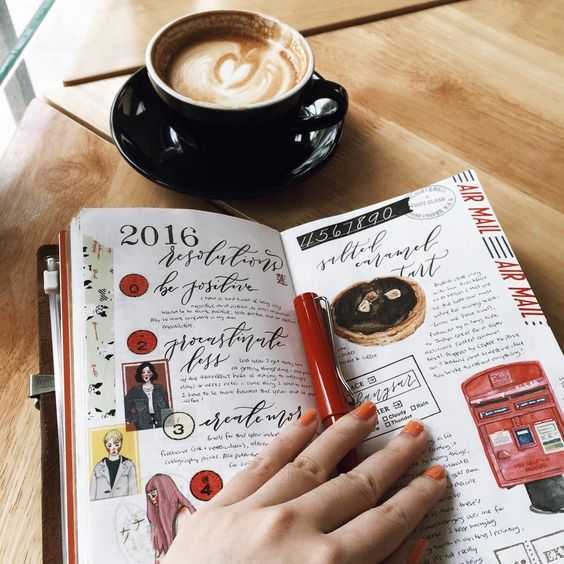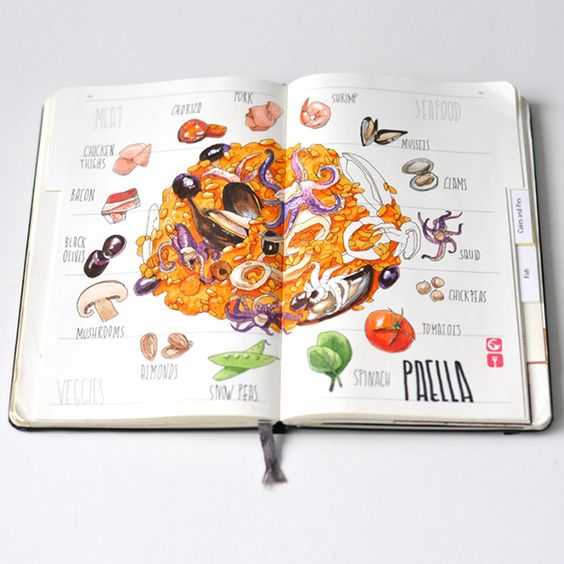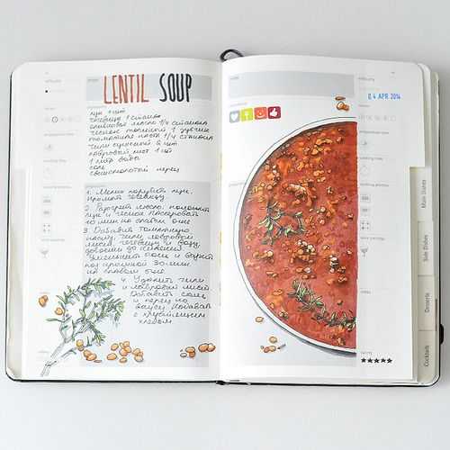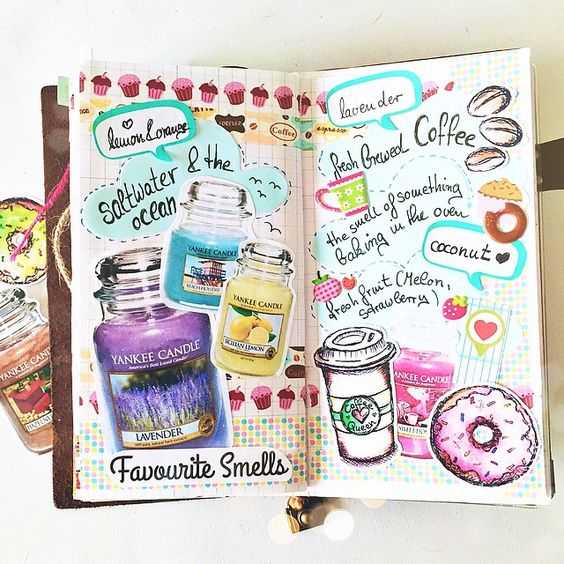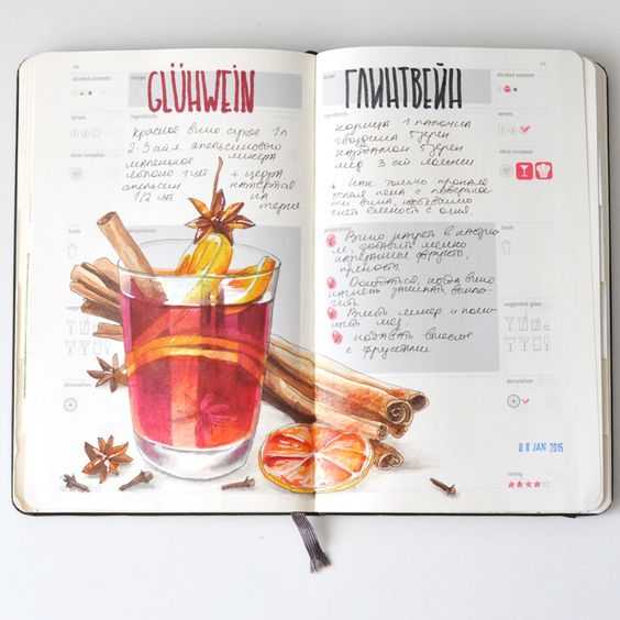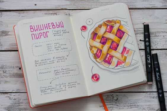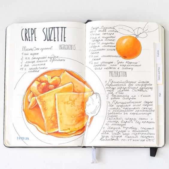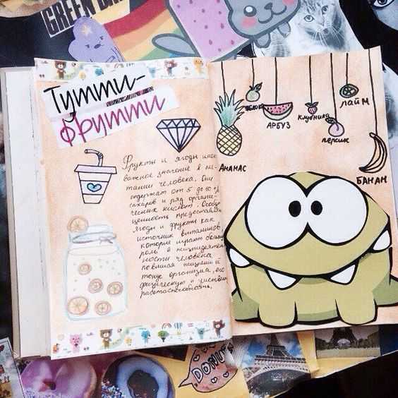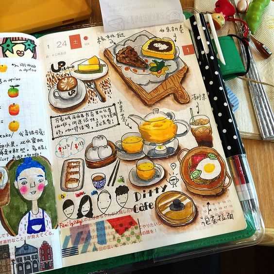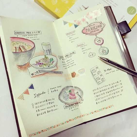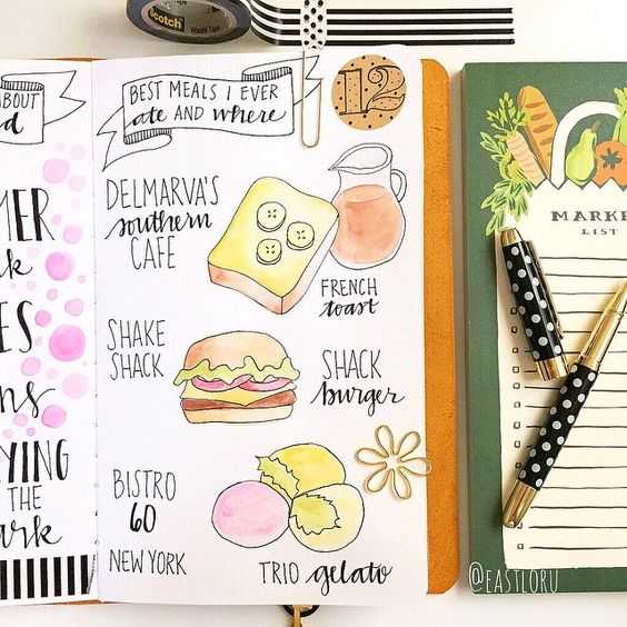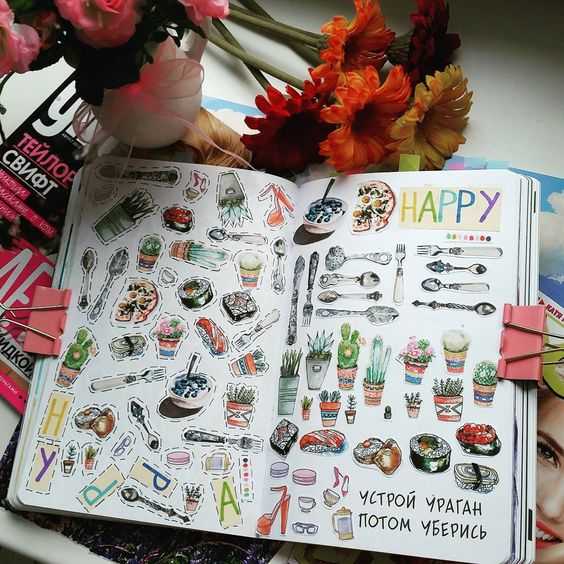 Если любите путешествовать, бывать в новых местах и предпочитаете вкусно покушать, обязательно делайте заметки с интересными рецептами, названиями вкусных блюд и напитков. Подключайте фантазию, рисуйте, используйте самые разные наклейки и стикеры. Все это поможет разнообразить раздел о еде.