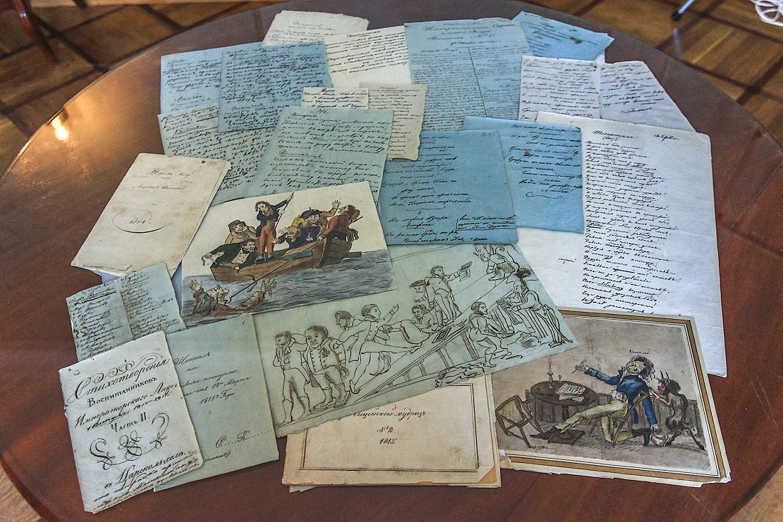 23. На столе разложены страницы и карикатуры из рукописных лицейских журналов.