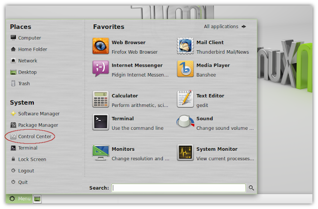 Нажмём на кнопку «Menu», чтобы открыть главное меню «Linux Mint 11», и выберем в разделе «System» («Система») слева пункт «Control Center» («Центр управления»):
