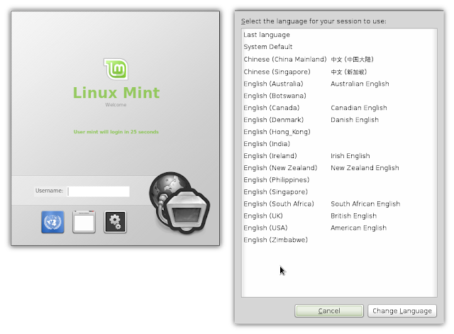 На завершающем этапе процесса запуска системы передо мной предстал обновлённый «Экран входа в систему» (MDM — Mint Display Manager), предлагающий пользователю выбрать подходящие настройки и войти под своим именем. Таймер неумолимо отсчитывал секунды, которые мне отводились на принятие решения. Нажав на первую слева кнопку, я увидел перед собой довольно длинный список языков, в котором, к моему большому разочарованию, не нашлось места для моего родного русского — и мне ничего не оставалось, как нажать на «Cancel» (отмена):
