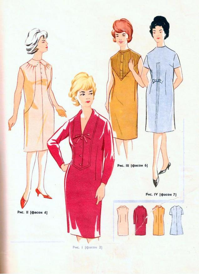По сравнению с днём сегодняшним, модели скромные, ещё не вошли широко в моду брюки и короткие юбки, минимум бижутерии, горошек и клетка, полоска и неброские цветы — самые популярные принты, а журналы мод были в основном рисованными. Помню в детстве (середина 60-х), я вырезала из маминой любимой книжки по шитью красивых цветных тётенек из вкладышей и рисовала для них одежду — складывался листочек пополам, прикладывалась эта бумажная кукла, обрисовывалась (желательно, чтобы на ней было минимум одежды изначально), потом рисовала всякую одежду, всё это вырезалось и одевалось на бумажную тётю. Помните? Когда мама это обнаружила, она не сильно меня ругала. Это потом уже в журналах "Пионер", "Работница", "Крестьянка" появились бумажные куклы с комплектом одежды, специально для вырезания.