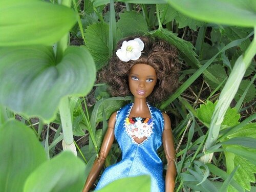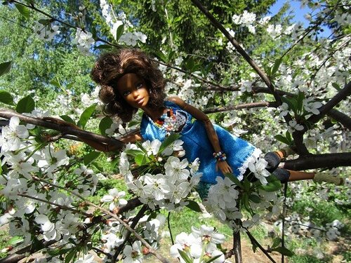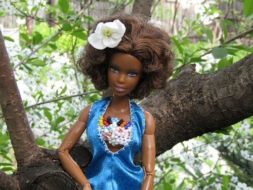 А дальше было как в скверном анекдоте, раствор бар, кирпич йок. Выкройка есть, куклы есть, ткань — не проблема, но размер! Коллеги, я же уже глазом вижу, что половинка лифчика размером не на Барби, а на между звездой Подиума и кем-то поменьше! Но идея меня уже захватила, и атласные лоскуточки от пошива летнего платья себе любимой кстати попались на глаза, и бисер… короче, дизайнер Балда проявил своё дизайнерское видение Красного бархатного платья! Встречайте: Констанс, Синяя атласная туника и лиф, таки вышитый бисером, хоть и вязаный