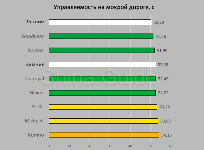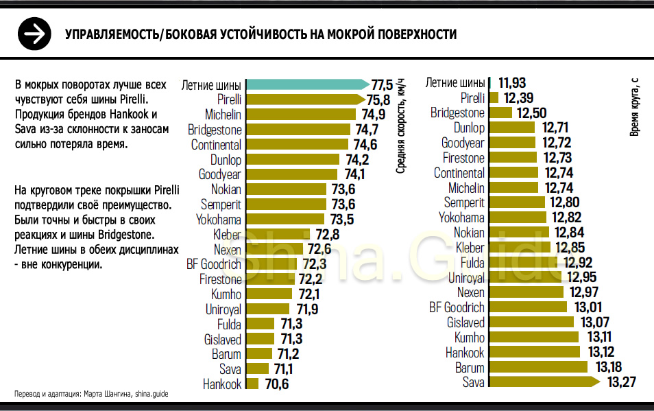 Боковая устойчивость, время прохождения круга в секундахШины Tigar Syneris и Infinity Ecosis пересекли финишную черту с разрывом в 0,1 балла, заняв при этом четвёртое и пятое места соответственно. Первых «подкосила» слабая управляемость на мокрой поверхности (сильные, сложно останавливаемые сносы колёс переднего моста), а вторых – низкая устойчивость к аквапланированию, особенно поперечному, и дисбаланс характеристик в мокрых условиях.