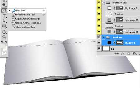 Шаг 3. В этом шаге мы займёмся тенями. Отдельно для каждой странички будем создавать тень. Активируйте инструмент Перо (Pen Tool) в режиме Слой-фигура (Shape) и создайте фигуры, как показано ниже на скриншоте. Цвет для них настройте чёрный #000000.