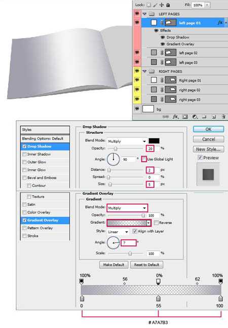Теперь настроим стили слоя для слоя left page 01. Дважды кликните по слою, чтобы вызвать диалоговое окно настроек стилей слоя. В этом окне настройте Тень (Shadow) и Наложение градиента (Gradient Overlay). Настройки смотрите ниже.