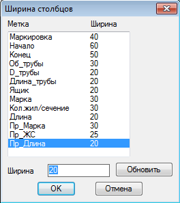 В диалоге «Ширина столбцов» в поле «Ширина» вводим значение для каждого столбца таблицы и нажимаем кнопку ОК.