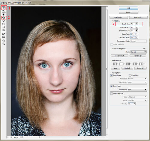 Под цифрой 1 - инструмент, которым можно как пальцем двигать контуры изображения. Им я подвину немного вверх щеки, сделаю поуже нос и подниму повыше брови.