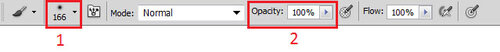 4. Итак, теперь выбираем инструмент "Кисточка" (Brush Tool), устанавливаем активным белый цвет. В палитре инструментов регулируем размер кисточки (1) и "Прозрачность" (Opacity, 2).Я предпочитаю устанавливать Opacity поменьше, процентов на 50, чтобы размытое изображение проступало не в полной мере, а послабее. Таким образом можно отрегулировать - какой участок будет размыт сильнее, какой слабее.