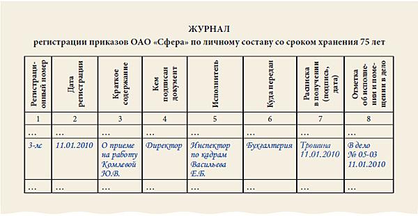Приказы на отпуск, имеющие срок хранения 75 лет, регистрируются отдельно (например, в Журнале регистрации приказов по личному составу).
