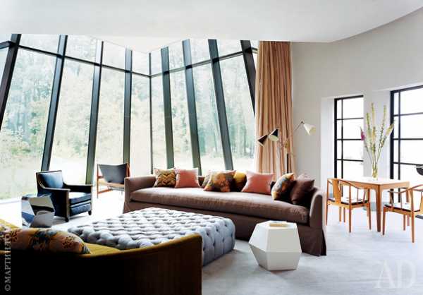 Сьюзи Худлесс столкнулась с самым необычным пространством в ее жизни. Внутри пирамиды на первом этаже гостиная, на втором – хозяйская спальня. Внутри конуса – две библиотеки. “Как декоратору оформлять круглую комнату с пирамидальными окнами, скажите на милость?” – смеется Сьюзи. Хозяева хотели, чтобы мебель в доме стояла дорогая, но при этом предупредили, что каждый уик-энд здесь будет собираться шумная компания.