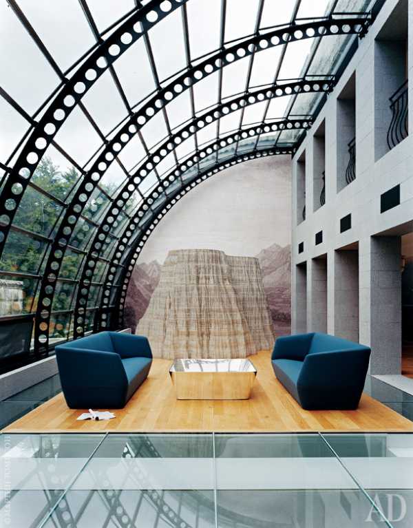 В “зимнем саду” нет растений, зато стоят диваны и столик Zero‑In, дизайнеры Эдвард Барбер и Джей Осгерби. На фоне обоев с горным пейзажем — скульптура Аниша Капура Mountain (1995).