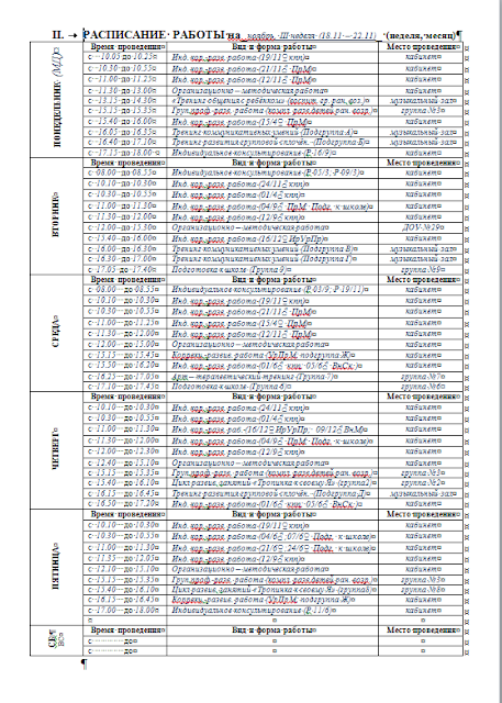 Возле "понедельника" Вы можете увидеть аббревиатуру МД. Это обозначение методического дня. Я отмечаю это, так как для меня это означает, что по своей организации этот день подвижен. Он может быть заполнен активной практикой, а может быть посвящён работе с бумагами. Я специально нашла и привела в пример две недели, которые выдались очень разнообразными по видам деятельности.