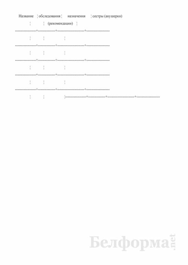 | N п/п | Месяц и число | Фамилия, имя и отчество | Дата рождения (год, месяц и число) | Адрес | Назначения | Данные обследования | Отметки о выполнении назначения (рекомендации) | Подпись медицинской сестры (акушерки) |