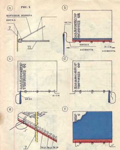 Надрезов должно быть на два больше, чем шнурков. Полотном пилы для металла сделайте надрезы Внимание! Перед надрезанием заберите крайние номера (например, 1 и 12). Теперь сшивайте Поочередные стадии работы показаны на рис. 2 Для сшивки нужна большая игла, нитки типа шпагат, дратва. При шитье вставьте левую ладонь между страницами (рис. 2а) и. пробивай корешок номера иглой, ведите нить внутри тетради от шнурка к шнурку, а сам шнурок подхватывайте ниткой снаружи (рис. 2Ь). Нитку затягивайте после каждой прошивки. После прошивки самого нижнего журнала нитку, выведенную обратно с правой стороны, завяжите в узелок с ее начальным концом. В следующих тетрадях в крайнем левом и правом положениях зацепляйте нитку в предыдущей тетради (рис. 2d-1). В последней гетради левую петлю с левой стороны сделайте двойной (рис. 2е), а с правой – вытянув нитку, свяжите с начальным концом (рис. 2l). После прошивки каждого журнала необходимо прижимать его к раме.