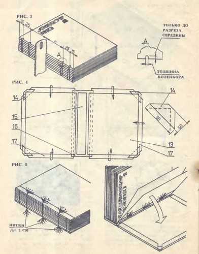 Затем приступайте к изготовлению обложки. Вырежьте из картона чва прямоугольника 13. которые по размерам должны быть несколько больше (5—6 мм) формата переплетаемого журнала. Приготовьте полоску картона 15 для корешка книжки, коленкор для корешка 16 и углов 14, бумагу для обклеивания обложек 17. Ширина корешка равна толщине готового комплекта журналов плюс две толщины картона обложек. Детали из картона, бумаги и коленкора режут острым ножом (например, сапожным) по линейке, следя за тем, чтобы углы были прямыми.