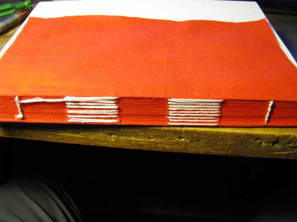 Быстро? А уже 16:35. Этим я и люблю подобные занятия: немного подумал, чуть-чуть повозился руками, а время уже прошло, незаметно и приятно. Но ведь сейчас не это Вас интересует, а то, что же делать дальше. А дальше картон приклеивается к ткани. Вернее, ткань к картону. Первым делом с лицевой стороны, затем переворачиваем и загибаем ткань на манер типографских книг, сначала вдоль коротких сторон, потом вдоль длинных. И склеиваем. Обложка почти готова, осталось лишь подержать её под прессом (обратите внимание, расположить обложку надо так, чтобы она ни к чему не приклеилась, иначе будет обидно).
