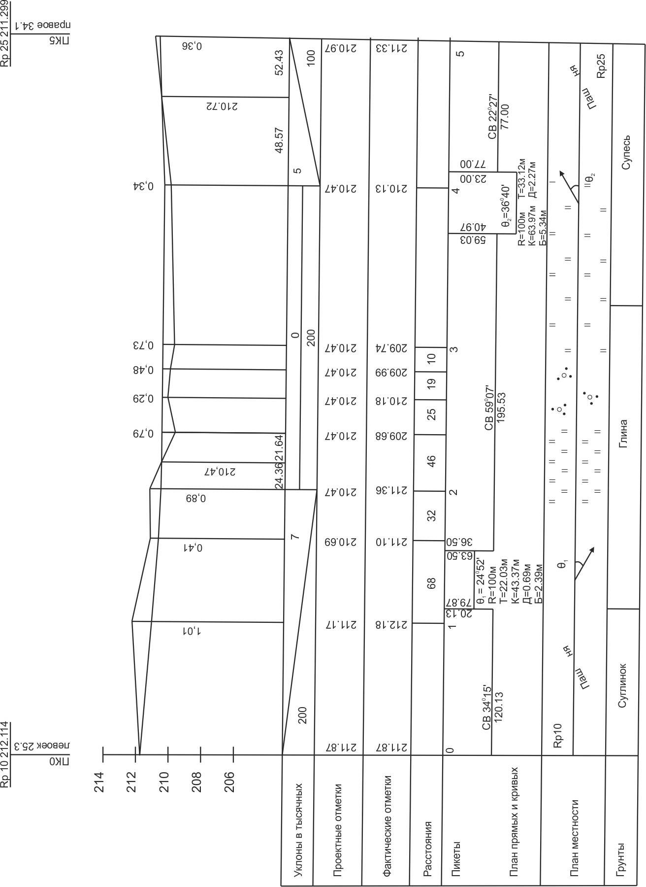 Продольный профиль вычерчивают тушью двумя цветами: черным и красным. Красным цветом вычерчивают все проектные данные: проектную линию, рабочие отметки, ось дороги в графе "Ситуация", все линии и надписи в графах "Проектные отметки", "Проектные уклоны", "Прямые и кривые в плане. Все остальные элементы профиля вычерчивают черным цветом.