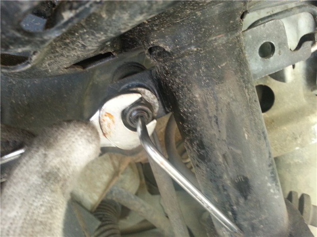 С помощью ключа на 16 и шестигранника откручиваем верхнюю гайку стойки стабилизатора