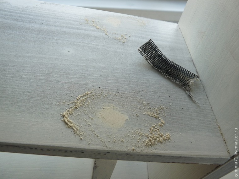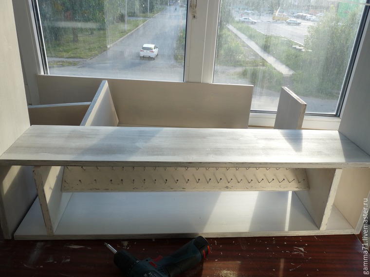 Наверняка, будет комментарий, что закрашивать неповторимый рисунок сосновой доски чуть ли не преступление, но я видела свою полку именнно окрашенной в светлые тона и немного состаренной. Объясняю почему: она должна была вписаться в интерьер, который меня окружает, а он наполнен белой мебелью в классическом стиле.