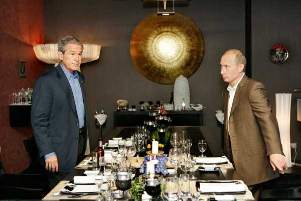 Владимир Путин и президент США Джордж Буш на утро после тяжелой ночи на саммите «Большой Восьмерки».